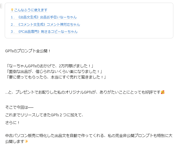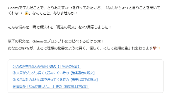 で、話がそれちゃったけど、こんなAIとかと縁遠そうなところでも考え方次第でGPTsはめちゃくちゃ使えるし、商品にすることもできるんだよ~