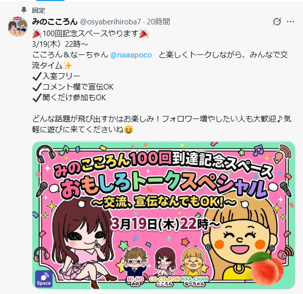 アカウントで毎日スペースをやっててね、